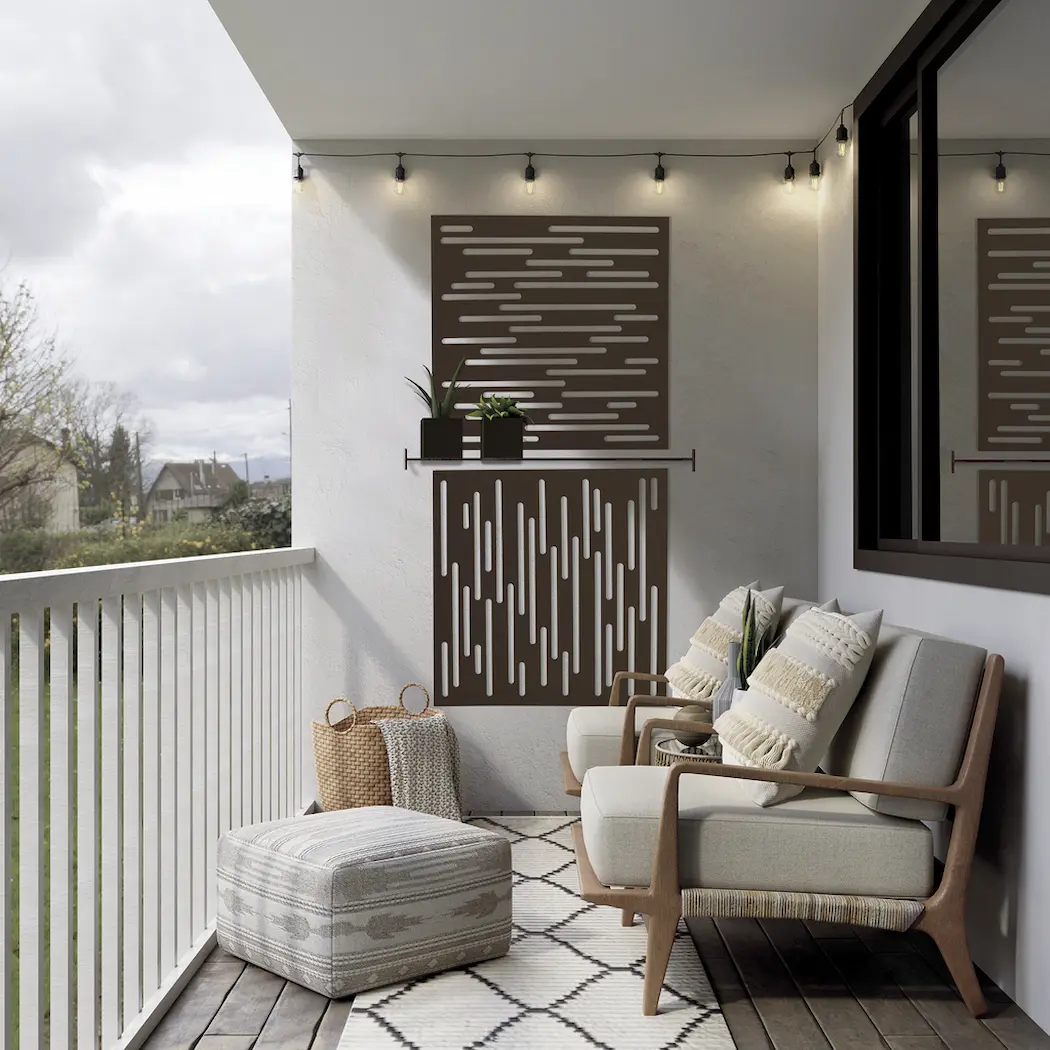 El panel Nautic es un modelo decorativo de formato cuadrado que combina funcionalidad y estilo. Gracias a su diseño innovador, con formas irregulares y redondeadas distribuidas de manera aleatoria, ofrece protección frente a miradas indiscretas, viento y sol, al mismo tiempo que genera efectos de luz únicos y originales.
