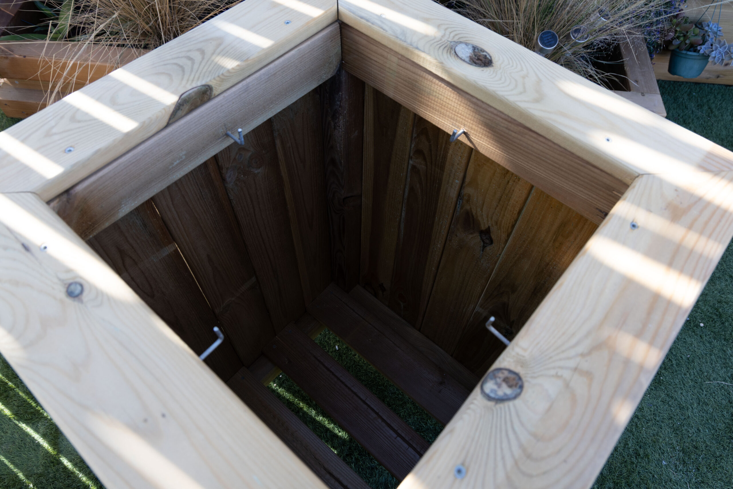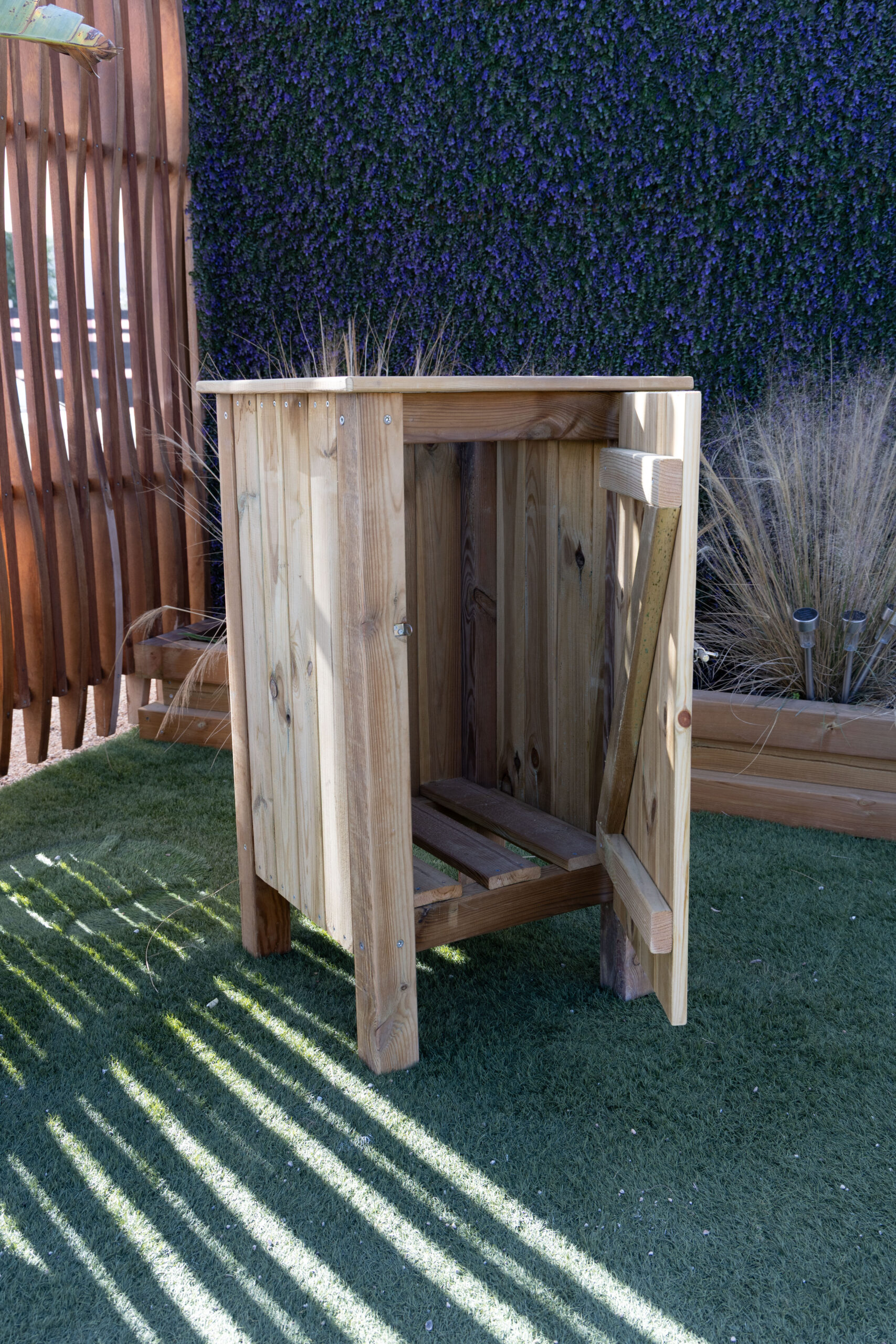 Papelera cuadrada con puerta, para acceso a bolsa. Fabricada con pino tratado en autoclave Riesgo IV.